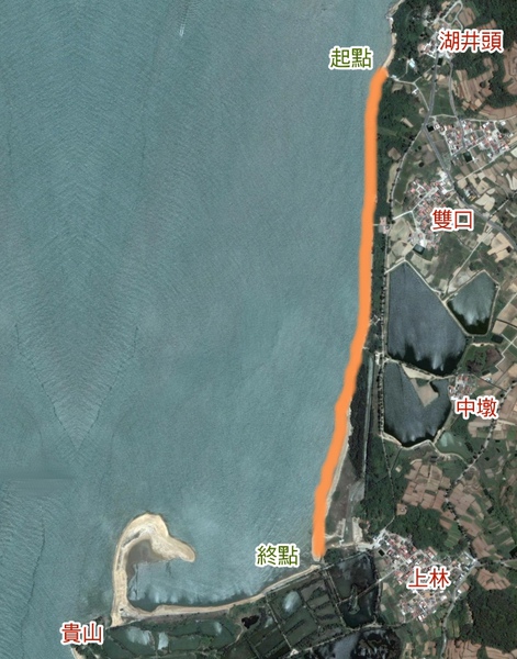 繞過湖井頭西北角水上堡後,在此海岸直轉變成南北走向,地形也從花岡石海岸變成沙岸。由於面向大陸廈門,在兩岸對峙時期為防止敵軍船艦登陸,海濱沙灘上有一排又一排的軌條砦。從湖井頭到上林貴山之間均屬沙岸地形,寬廣的潮間帶佈滿蚵田,富饒的海域,諸多的居民仰賴為生。