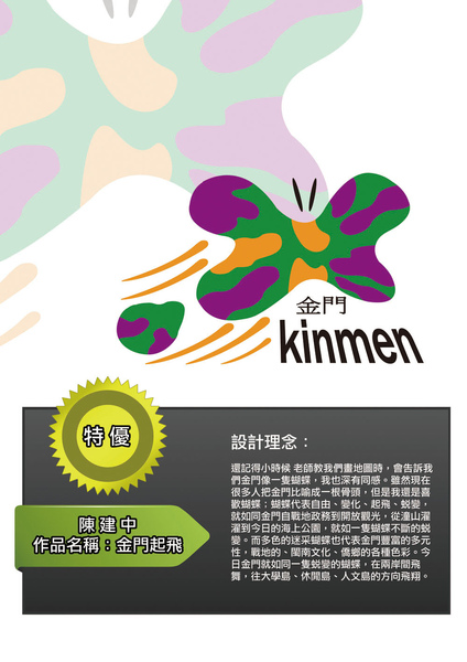 金門縣政府公開徵求「迷采金門」創意LOGO設計徵選競賽活動」評比結果已出爐,昨日下午並於縣府大禮堂舉辦頒獎典禮及記者發布會,得獎作品計畫再覓合宜的公共空間陳展。而來自小金門的陳建中並以「金門起飛」作品,捧走特優獎;陳建中希望金門發展就像設計的蝴蝶圖案,翩翩起飛。