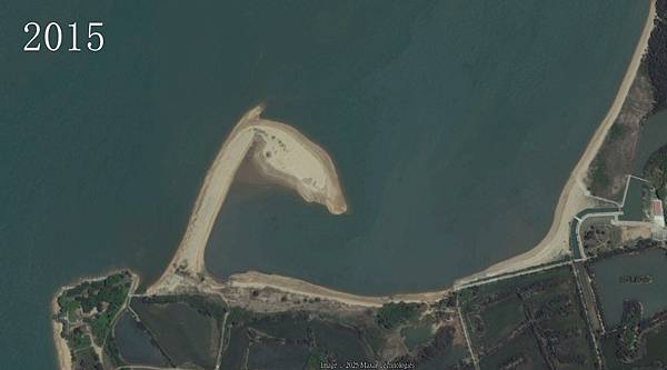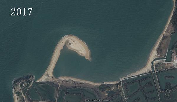 從2010年的衛星圖來看,可清楚地發現,海岸漸漸變淺,原出海口處已嚴重積沙,沙嘴處的石蚵養殖處也漸被積沙掩蓋。