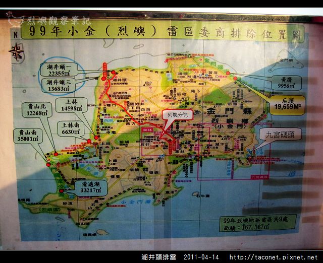 湖井頭雷區包含2處,從L-029~L-036據點海岸,共36,038平方公尺,其中湖井頭一為22,355平方公尺,湖井頭一為13,683平方公尺。目前排雷工作已近尾聲。