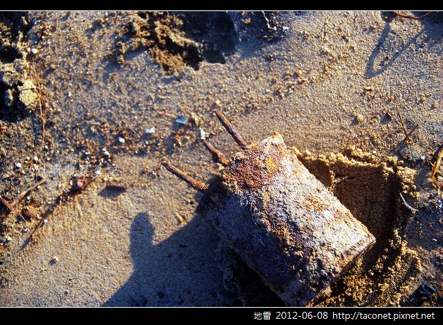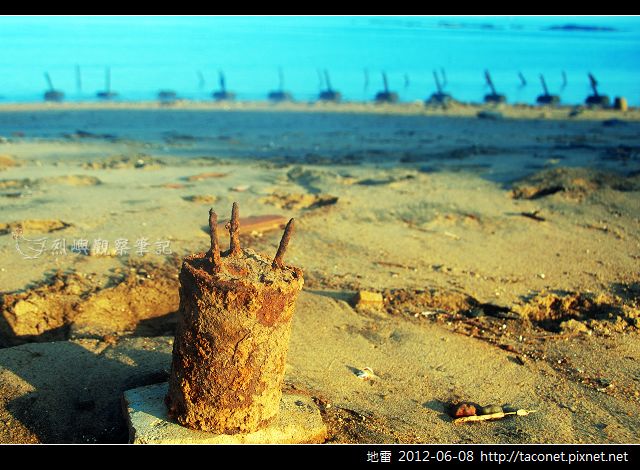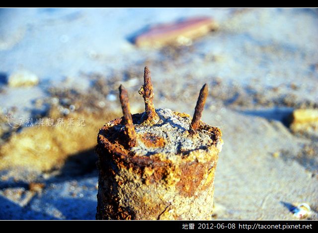 今天一大早在海邊驚見三枚地雷,看多了各式各樣的地雷,這三枚卻從未見過。此地已排雷完成多時,為了安全還是小心翼翼地接近觀察。