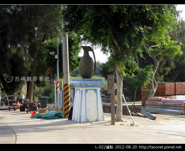 據點前方原是體能訓練場,目前僅留一堵高牆及門口的手榴彈模型。這張照片是在民國93年間拍的,當時是有駐軍,營區也很完整。這裡也是村民下海採蚵的出海口,當時設有蚵管哨由當地駐軍管制村民下海。