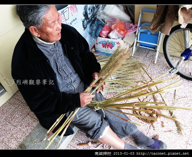 洪朝根說,高粱掃把要綁得漂亮不容易,得費盡工夫。全部手工製作,整株高粱稈整理成束、一束束固定、綁紮、穗花打散成傘狀、穗花部份需再經紮綁、調整、修剪才完成,手續繁瑣,每個環節都不能馬虎,否則容易鬆脫散開而無法使用。平均一把要花上一小時時間,談成本似乎難以計算,工大於本,純粹自用而已。