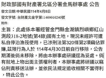 中華民國114年4月8日,財政部國有財產署北區分署金馬辦事處公告指出,位於烈嶼鄉紅山測段地號318-2之國有土地,未經許可不得停泊漁筏或進行使用。違者將涉嫌刑法第320條第2項竊佔罪。公告限相關行為人應於114年4月30日前自行移除漁筏,逾期未改善者,辦事處將研議逕行處置。若有民眾主張地上物權利,辦事處亦將考量以刑事竊佔罪名移送法辦,並依民法追收不當得利。特此公告。