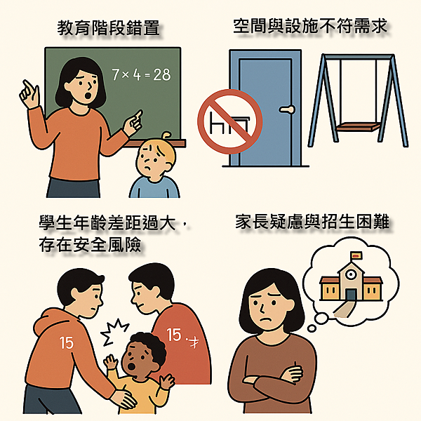 - 家長可能對將3-6歲幼兒送入「國中校園」心生排斥。